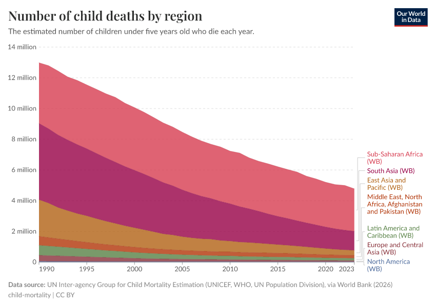 UN Inter-agency Group for Child Mortality Estimation (via World Bank) (2025) – processed by Our World in Data. “Number of child deaths by region” [dataset]. UN Inter-agency Group for Child Mortality Estimation (via World Bank), “World Development Indicators” [original data]. Retrieved March 13, 2025 from https://era5-cont.owid.pages.dev/grapher/child-deaths-igme-data