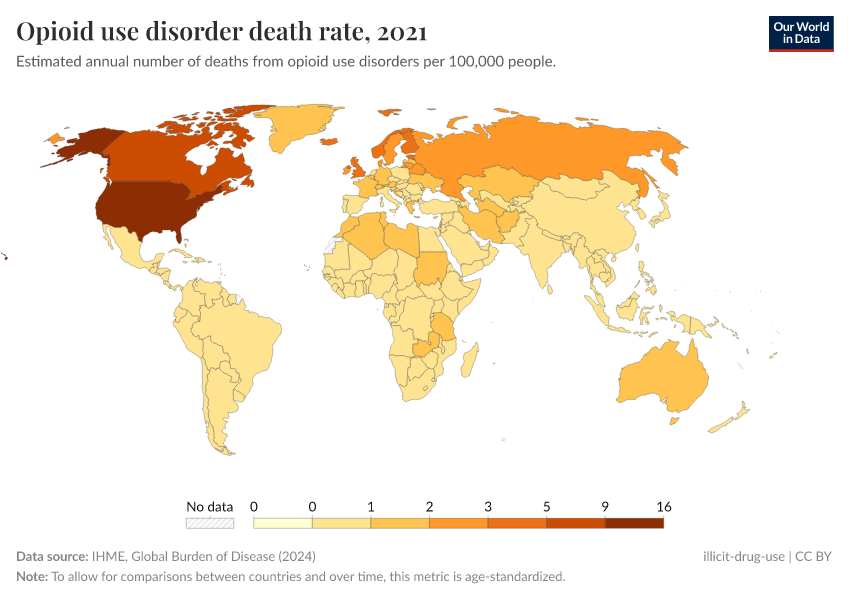 IHME, Global Burden of Disease (2024) – with minor processing by Our World in Data. “Opioid use disorder death rate” [dataset]. IHME, Global Burden of Disease, “Global Burden of Disease - Deaths and DALYs” [original data]. Retrieved March 13, 2025 from https://era5-cont.owid.pages.dev/grapher/death-rate-from-opioid-use