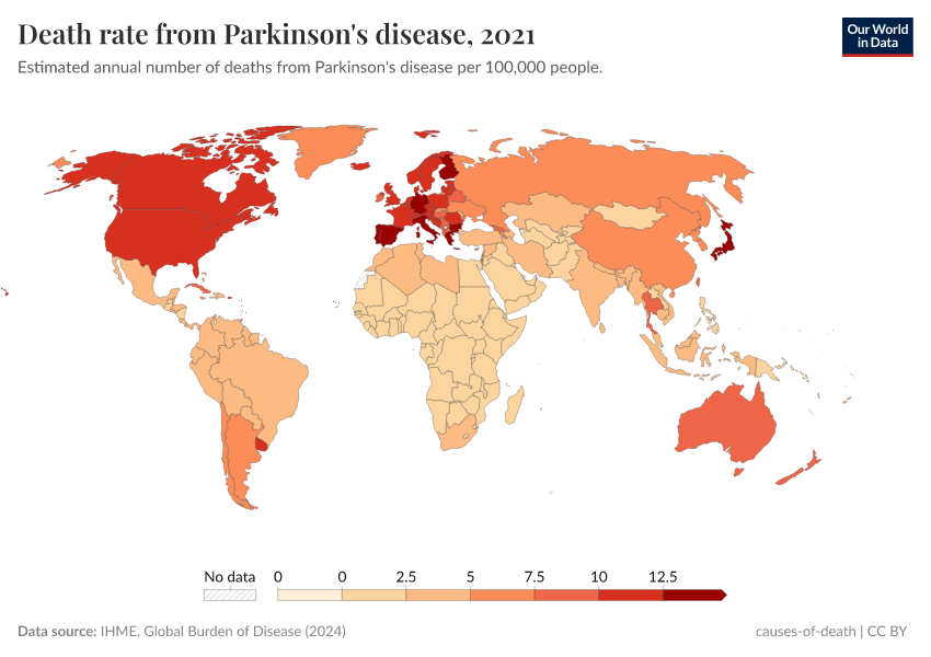 IHME, Global Burden of Disease (2024) – with minor processing by Our World in Data. “Death rate from Parkinson's disease” [dataset]. IHME, Global Burden of Disease, “Global Burden of Disease - Deaths and DALYs” [original data]. Retrieved March 13, 2025 from https://era5-cont.owid.pages.dev/grapher/death-rate-from-parkinsons-disease-gbd