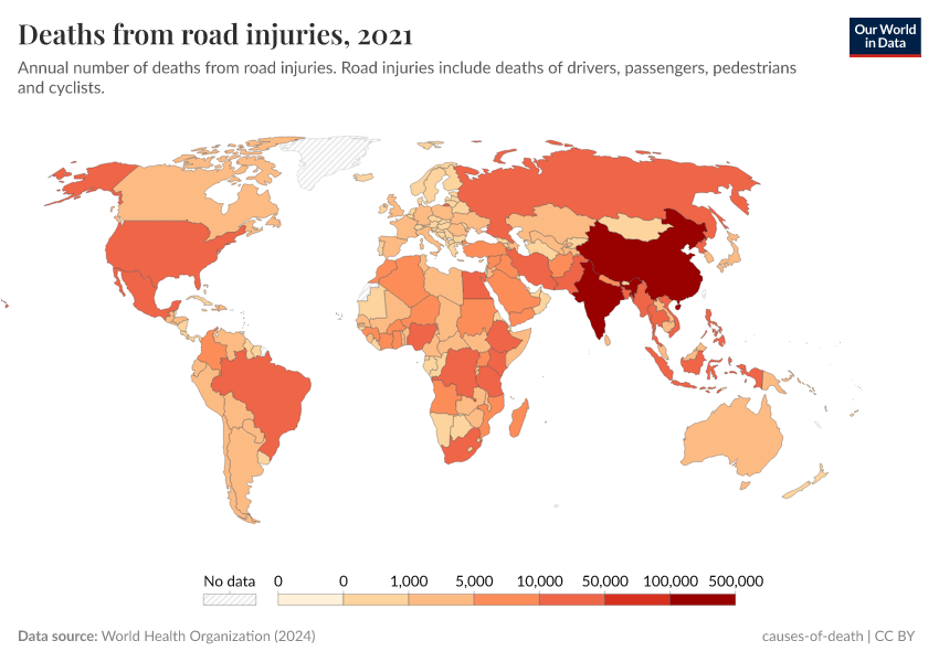 World Health Organization (2024) – with major processing by Our World in Data. “Deaths from road injuries” [dataset]. World Health Organization, “Global Health Estimates” [original data]. Retrieved March 13, 2025 from https://era5-cont.owid.pages.dev/grapher/deaths-from-road-injuries