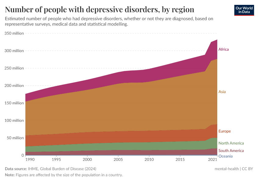 IHME, Global Burden of Disease (2024) – with major processing by Our World in Data. “Number of people with depressive disorders, by region” [dataset]. IHME, Global Burden of Disease, “Global Burden of Disease - Mental Health Prevalence” [original data]. Retrieved March 13, 2025 from https://era5-cont.owid.pages.dev/grapher/number-suffering-from-depression-by-region