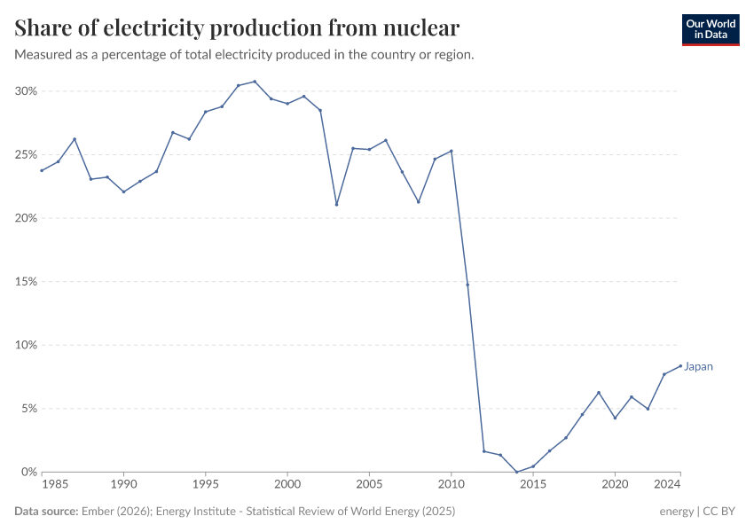 Ember (2024); Energy Institute - Statistical Review of World Energy (2024) – with major processing by Our World in Data. “Share of electricity generated by nuclear power – Ember and Energy Institute” [dataset]. Ember, “Yearly Electricity Data”; Energy Institute, “Statistical Review of World Energy” [original data]. Retrieved March 13, 2025 from https://era5-cont.owid.pages.dev/grapher/share-electricity-nuclear