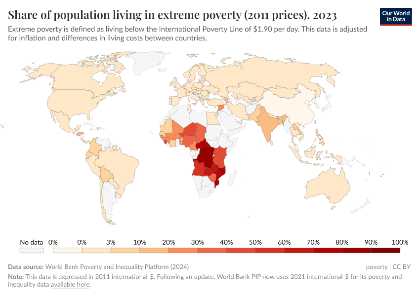 World Bank Poverty and Inequality Platform (2024) – processed by Our World in Data. “$1.90 a day - Share of population in poverty” [dataset]. World Bank Poverty and Inequality Platform, “World Bank Poverty and Inequality Platform (PIP) 20240627_2017, 20240627_2011” [original data]. Retrieved March 13, 2025 from https://era5-cont.owid.pages.dev/grapher/share-of-population-in-extreme-poverty-2011-ppp
