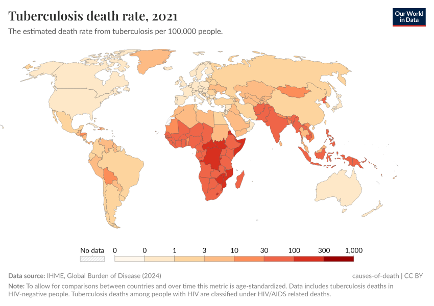 IHME, Global Burden of Disease (2024) – with minor processing by Our World in Data. “Tuberculosis death rate” [dataset]. IHME, Global Burden of Disease, “Global Burden of Disease - Deaths and DALYs” [original data]. Retrieved March 13, 2025 from https://era5-cont.owid.pages.dev/grapher/tuberculosis-death-rates