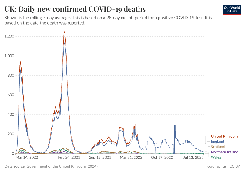 Government of the United Kingdom (2024) – with minor processing by Our World in Data. “UK: Daily new confirmed COVID-19 deaths” [dataset]. Government of the United Kingdom, “UKHSA data dashboard” [original data]. Retrieved March 13, 2025 from https://era5-cont.owid.pages.dev/grapher/uk-daily-covid-deaths