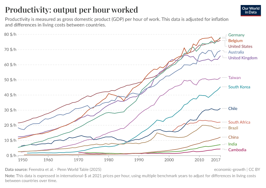 People are able to work less when they work in more productive economies
